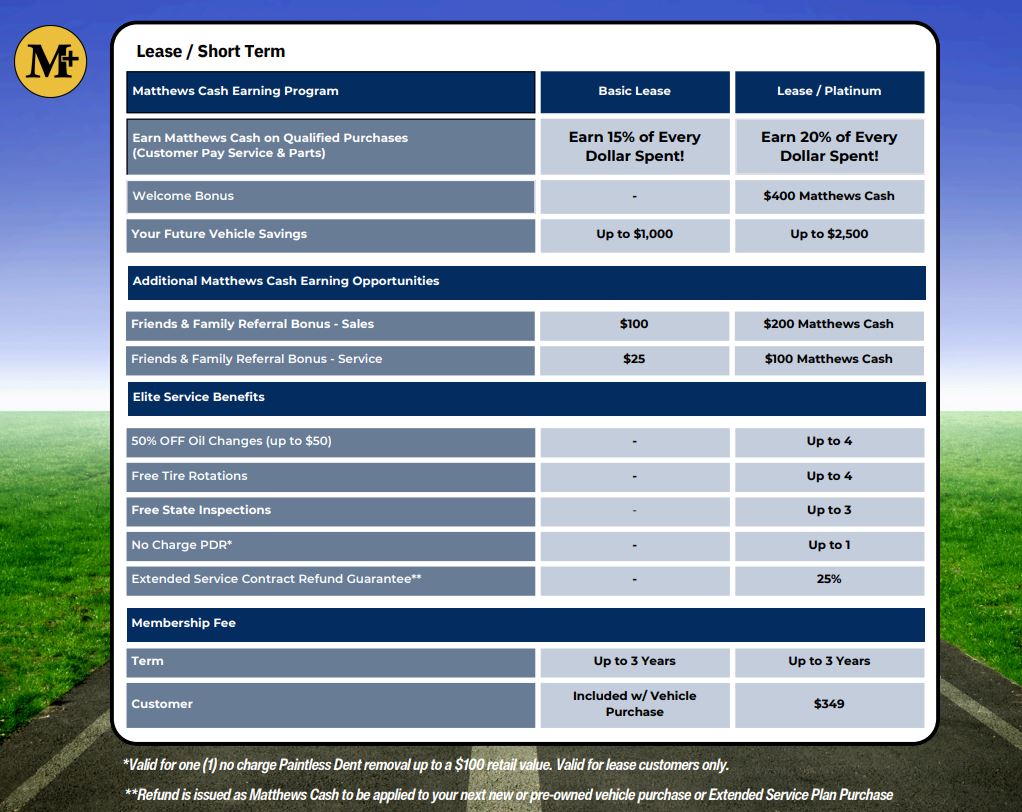 Your Matthews ownership experience includes access to members only benefits like FREE State Inspections, Discounted Oil Changes, FREE Tire Rotations and MORE! View the chart below to learn all of your potential savings!